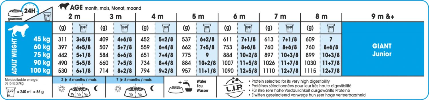 Au tout début de sa vie, votre grand chiot grandit à la vitesse de l’éclair. Après 8 mois, il est déjà à 90% de sa taille adulte. Incroyable comme il est déjà grand. Mais pendant cette croissance énorme, le système digestif est encore en développement. Votre chien reçoit-il tous les nutriments nécessaires durant cette phase? Giant Puppy de ROYAL CANIN® aide à faciliter la digestion. L’alimentation est également facile à digérer et contient tout pour une croissance saine et équilibrée.