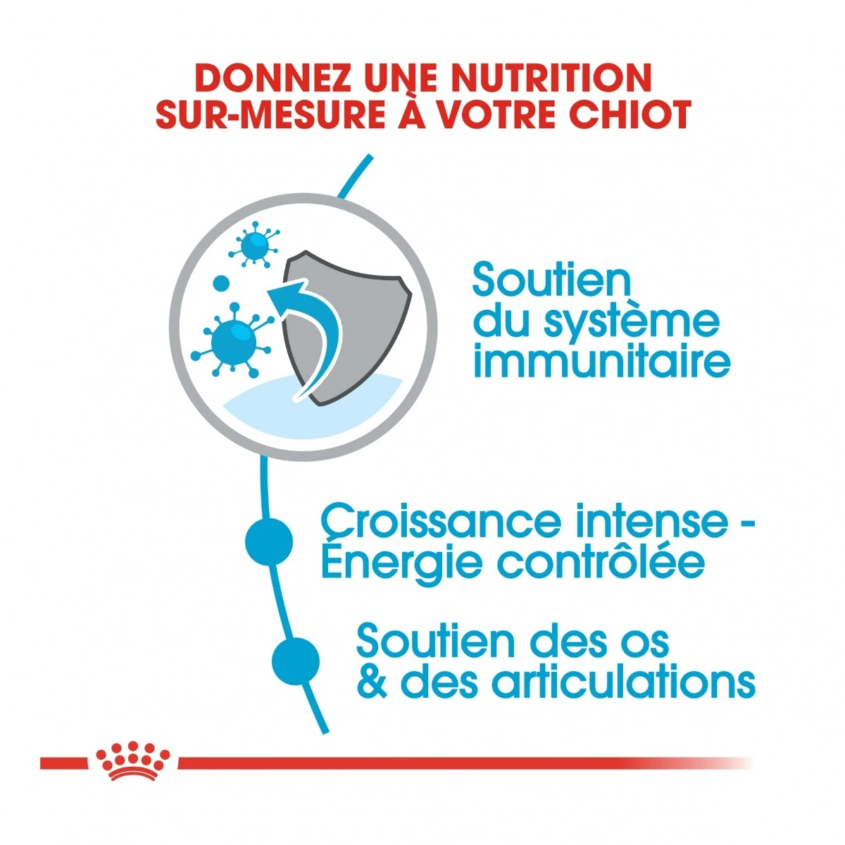 Aide à soutenir le rythme élevé pendant la première phase de croissance du chiot de très grande taille et à réduire le risque de prise de poids excessive grâce à un apport contrôlé en énergie. - Soutien des os et des articulations