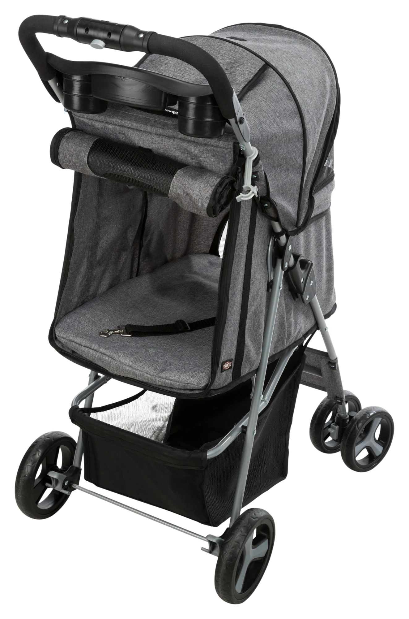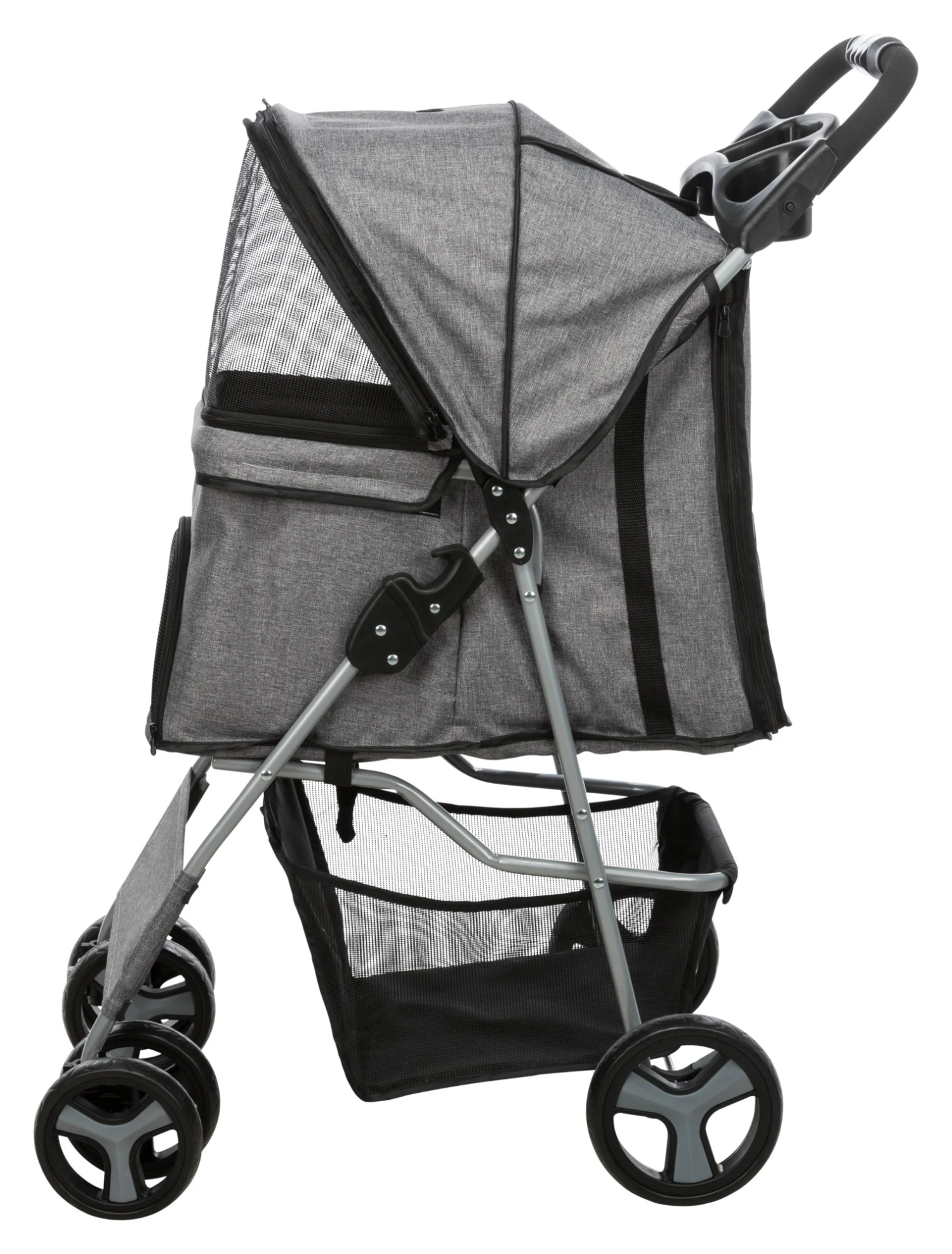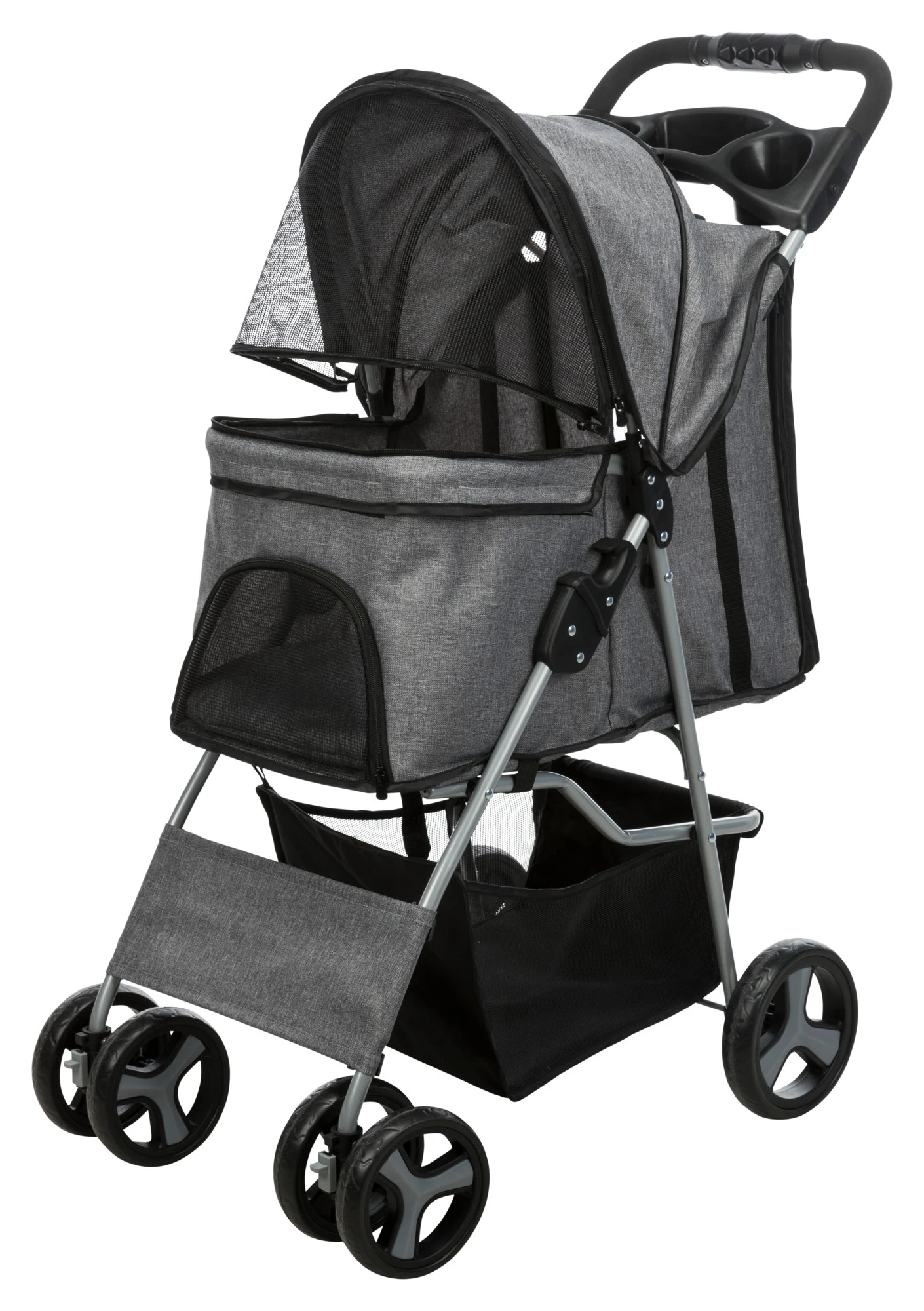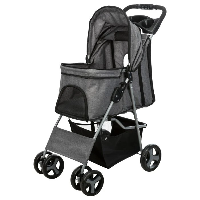Buggy pour chiens. Cette poussette est dotée d’un système de pliage rapide et la barre de poussée peut être actionnée d’une seule main. Il y a deux freins de stationnement.